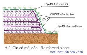 ⇔ Chức năng gia cường: do có tính chịu kéo cao nên đơn vị thiết kế áp dụng đặc tính này để giúp truyền hoặc tăng cường cho đất khả năng chịu kéo để gia tăng và cố định nền cốt cho đất. Người ta cũng có thể dùng các túi may bằng vải địa kỹ thuật để chứa đất.