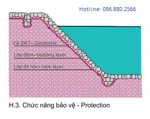 ⇔ Tính năng bảo vệ: do có tính bền kéo, chống đâm thủng cao lại thêm tính năng thân thiện môi trường, trơ với kiềm và axít, chịu được nước biển mặn và khả năng tiêu thoát nước nhanh. Vải địa kỹ thuật được dùng kết hợp với một số vật tư địa kỹ thuật khác như bê tông, đá, rọ đá, rồng đá, tạo thành lớp đệm ngăn cách chống và bảo vệ cho triền đê, bờ đập, hành lang ven biển hay các cột bê tông cột trụ của cầu.