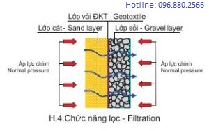 ⇔ Tính lọc: người ta sử dụng vải địa kỹ thuật ở giữa 2 lớp vật liệu khác nhau, có thể khác nhau về hệ số thấm hay về hình dáng kích thước. Nhờ có lớp lọc này mà các hạt có kích thước nhỏ từ 0,075 micromet cũng không thể lọt qua hoặc thất thoát với tỷ lệ rất thấp 095 tức là mất đi 5% loại có cỡ 0,075 micromet