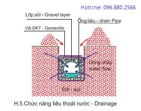 ⇔ Tính thoát nước: nhờ tính thấm nước tốt và đặc tính xuyên kim, cấu tạo từ các loại sơ nên dễ dàng cho nước đi qua theo cả phương thẳng đứng lẫn phương ngang. Các hạt nhỏ không đi qua lớp vải và cũng không cản trở việc tiếp tục thấm thoát nước ngay cả khi có những hạt mịn được giữ lại. Người ta có thể kết hợp với màng chống thấm để thu nước thấm qua vải địa.